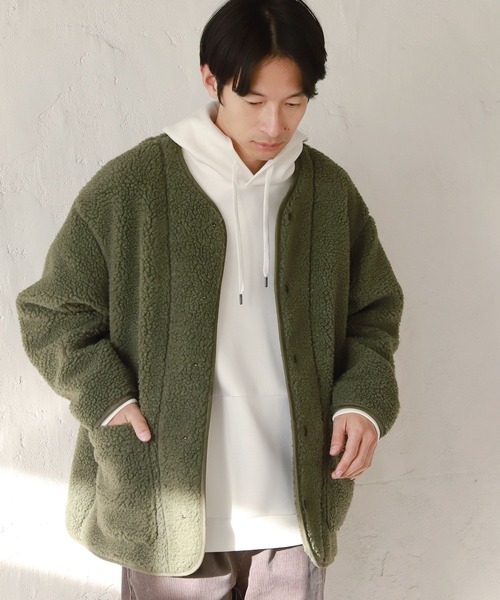サッと羽織りやすいカーディガンタイプのジャケット。暖かなボア素材で、シーズンムードもたっぷり。裏地付きなので、着脱もスムーズです。【素材】軽くて暖かい、ポリエステルボアを使用。もこもこでふっくらとしたボリューム感が特徴です。【スタイリング】ノーカラータイプでどんなアイテムにも合わせやすく気軽に羽織れるアウターです。パーカーとの相性も抜群です。