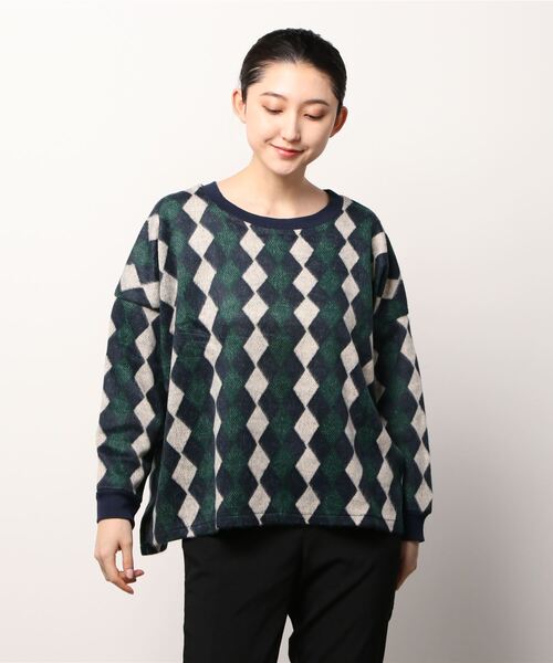 温もりある素材が秋冬らしい起毛ニットソー。インパクト大のアーガイル柄が魅力的です。首元とフェイスラインをすっきり見せてくれるクルーネックデザインで、大人の抜け感をプラス。リラックス感のある、程よいワイドシルエットでこなれた雰囲気に着こなせます。