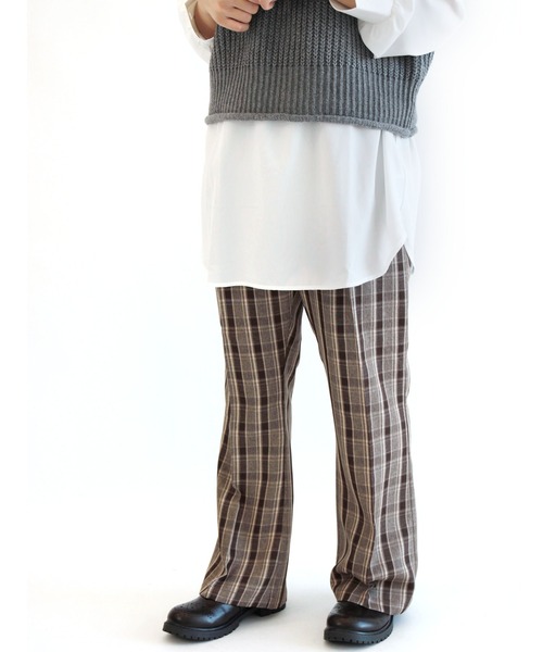 脚長・美脚を叶えてくれる裾フレアが魅力のロングパンツ。センタープレス入りできちんと感もプラスしました。メリハリのあるシルエットながらも伸縮性のある素材感とウエスト後ろのゴム仕様でストレスフリーな着心地も◎。ワンカラーにチェックアソート展開で、カジュアルにも上品にも着こなせる優秀アイテムです。