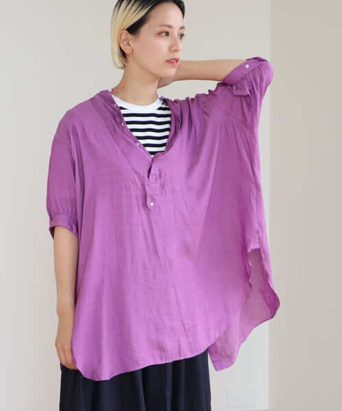 バックスタイルにも注目! ヴィンテージライクな雰囲気が魅力のサテンブラウスが登場。ユーズド感を演出するために、あえて表面に動きのあるサテン素材を採用しました。落ち感と適度な光沢が女性らしい印象の1着。背中に開きのあるデザインは、インナーに柄物やロゴアイテムを忍ばせたレイヤードスタイルをお楽しみいただけます。 ※光の当たり具合やパソコンなどの閲覧環境によって実際の色味と異なって見える場合がございます。予めご了承ください。 ※商品の色味は商品単体で撮影した画像をご参照ください。 【YELLOW】STAFF Model:H162(cm)Size:ONE SIZE 【LILAC】STAFF Model:H159(cm)Size:ONE SIZE 生地の厚さ:薄手 透け感:なし 伸縮性:なし 光沢感:あり 裏地:なし 【スタッフレビュー】 スタッフ:ハルカワエ 身長:161cm / 普段サイズ:M / 着用サイズ:ONE SIZE サイズ感: ゆったりしていてレイヤードにもオススメ 素材感: さらっとしているので暑い日にも重宝しそう ポイント: サテンの光沢感が揺れるたび綺麗です スタッフ:Heg. 身長:159cm / 普段サイズ:M / 着用サイズ:FREE サイズ感: 全体的にゆとりのあるサイズ感で、インナーをいれることももちろん可能です。 素材感: てろっとした光沢感のある素材で揺れると美しいです。 ポイント: ボタンの開閉で雰囲気がぐっと変わるのを楽しんで欲しいアイテムです!