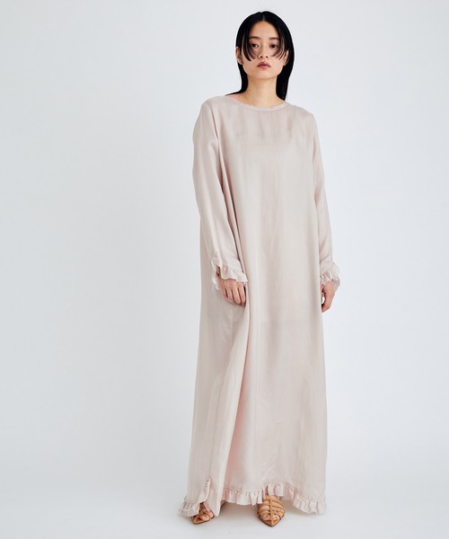 provoke(プロヴォーク)の別注キュプラフリルワンピースprovoke(プロヴォーク)の別注ワンピースはアダムエロペでしか手に入らないスペシャルアイテムです。【Design】落ち感のあるキュプラを使用したロングワンピース。袖や裾部分には切りっぱなしの生地を使用したフリルをあしらい、ヴィンテージのような表情になっています。1枚で着るのはもちろん、オーバーサイズのトップスとの重ね着もおすすめです。【Material】程よいツヤ感のあるキュプラ素材を使用。日常着にも、パーティーや結婚式などにもおすすめです。【Color】ブラック、オフホワイト、ラベンダーの3色展開です。【Brand】provoke(プロヴォーク)provoke=挑発する 引き起こす 刺激する服は着る人がどう着るか決めればいいという理念のもと、ジェンダーレス、タイムレス、エイジレス、色々な垣根や決めつけを無くし、自由な発想でスタイリングを提案します。-----------裏地:なし光沢感:ややあり透け感:あり伸縮性:あり生地の厚さ:薄手-----------※画像の商品はサンプルです。お届けする商品に仕様・サイズ等の変更が生じる場合がございます。予めご了承ください。※ロケ撮影画像は光の当たり具合で色味が異なって見える場合がございます。商品の色味はスタジオ撮影の画像をご参照ください。