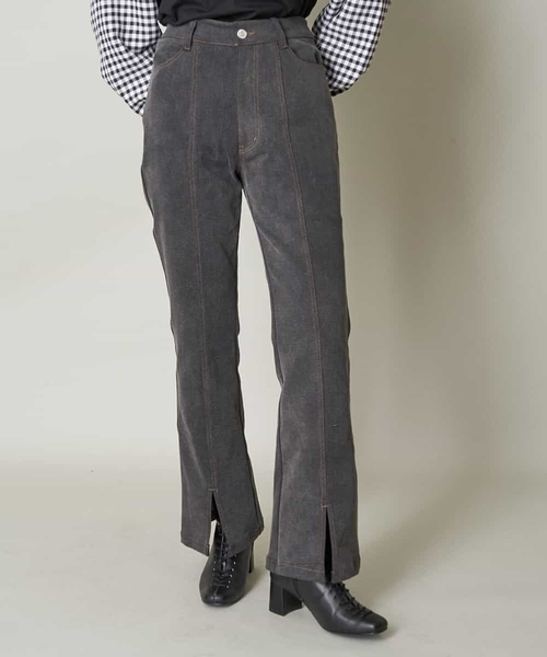 【デザインポイント】センター切替がシルエットをスマートに見せてくれます。トレンドの裾フレアのデザインが女性らしさをプラス。【着用コメント】後ろがゴム仕様なので着心地が良い。ストレッチが入った生地なのでストレスフリーに着用できます。センタースリットが脚長効果を生み出してくれます。