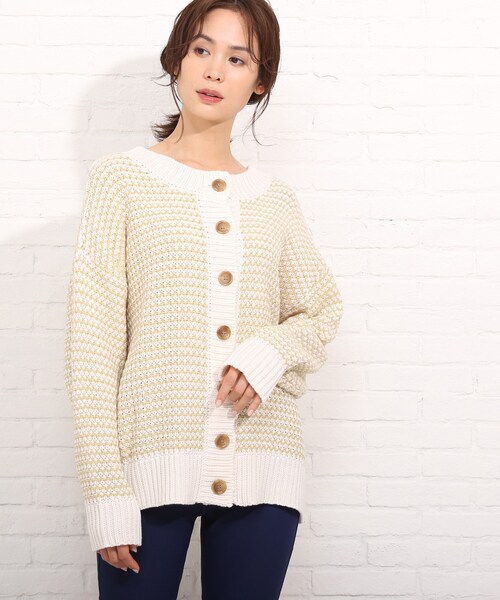 【デザイン】凹凸の立体柄を複数本の糸でざっくり編んだニットカーディガン。本体の柄を引き締める太めのリブ切り替えでゆるさの中にもキリっとした印象に。大きめのボタンを多めにつけたことはデザインポイント兼閉じて着てもインナーが見えにくいというメリットも。身幅広め&ドロップショルダーでこなれた雰囲気があり、体型カバーしながら今年らしいスタイングをかなえてくれます。【生地感】適度な厚みを持った、暖かな着心地が魅力のニット生地です。【スタッフ着用コメント】前後2WAYで使え、トップスとしてもカーディガンとしても使えるニットなので、着回し力が高いです。レモンイエローとブルーにはベージュのボタンが付いていてデザインのアクセントになっています。シンプルなデニムやモノトーンのパンツなどと合わせるだけでもオシャレ見えしてくれること間違いなしです!ブラックはボタンも含め全体が白と黒の2色でまとまっているので、ボトムにカラーパンツなどを合わせると一気に旬顔コーデが完成します。モデル情報:身長167cm B79 W59 H87 着用サイズ:00店舗へのお問い合わせ商品番号:C62-34301●製品寸法:00(FREE):着丈62cm B116cm 袖丈47cm 肩幅62cm備考: