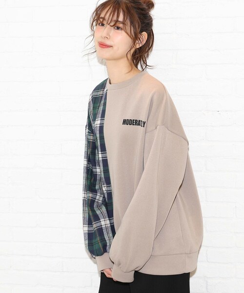 【デザイン】 無地とチェック地を切り替えたアシメデザインが目を引くプルオーバー。 前後にはロゴプリントをあしらい、カジュアルスポーティな表情をプラス。 ボディをすっぽりと包み込むルーズなシルエットで、サッと着て抜け感あるスタイリングが完成します。 【生地感】 無地部分は肉厚感のある裏起毛素材で、ふっくら柔らかな肌当たりです。 チェック地は布帛仕立てとなり、しっとりした風合いです。 ※オフホワイト(003)はやや透け感があるため、インナーの着用をおすすめします。 #CutieBlonde#Cutie#cutieblonde#cutie#キューティブロンド#キューティ#20代#30代 こちらの商品は主に春に着用いただける商品です。 モデル情報:身長168cm B78 W58 H84 着用サイズ:00(FREE) 店舗へのお問い合わせ商品番号:256-14330 ●製品寸法: 00(FREE):着丈66cm B118cm 袖丈52cm 肩幅61cm 備考: