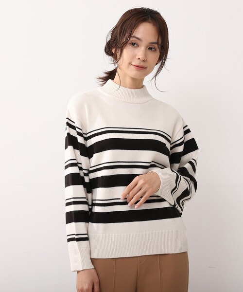 ■デザイン 配色がアクセントになった、マルチボーダーニットです。 やや首詰まりのクルーネックがポイントです◎ お袖のボリューム感がポイントになっています。 ■生地感 もちもちっとした肌触りが気持ち良いです! ■STAFF着用コメント 幼い印象になりがちなマルチボーダーのニットも首元が詰まっているので大人顔になります。 しかも顔まわりをすっきりキレイに見せてくれます! ぽわっとしたお袖も今年らしくて気に入りました^ ^ ■スタイリング 程よい丈感で、ボトムにインでもアウトでも合いますよ◎ ボトムとシューズを変えればカジュアル以外でも使いやすいマルチボーダーです◎ スニーカーやモカシンシューズで合わせるとカジュアルに。 キレイ目ブーツで合わせてフェミニンに。 ローファーで合わせてクールに。 モデル情報:身長167cm B79 W59 H87 着用サイズ:02(M) 店舗へのお問い合わせ商品番号:741-14001 ●製品寸法: 02(M):着丈56cm B102cm 袖丈51cm 肩幅43cm 03(L):着丈58cm B108cm 袖丈52cm 肩幅45cm 04(LL):着丈60cm B114cm 袖丈52cm 肩幅46cm 備考: