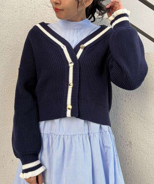 袖口のフリルがかわいらしく、ゴールドボタンで上品さも兼ね備えたニットカーディガンです♪ しっかりとした厚手の生地でありながら、襟ぐりからのラインが縦長効果で重すぎない印象◎ ショート丈なのでボトムスを選ばず、様々なプレッピースタイルが楽しめるオススメアイテムです☆