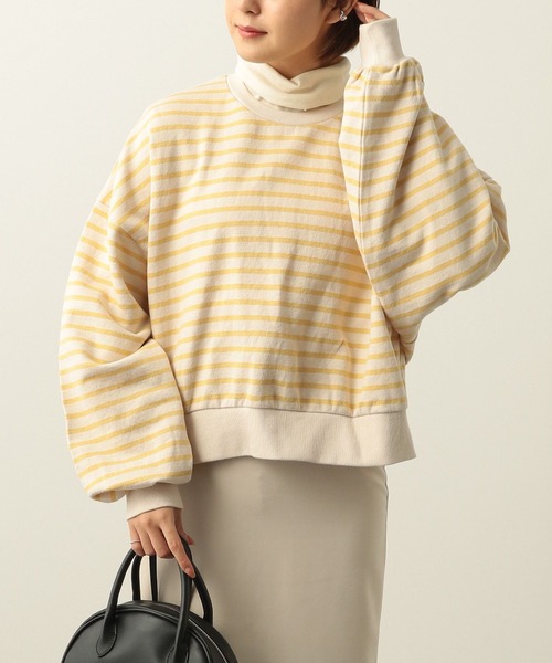 ーーー【デザイン】ロングシーズン愛用できるボーダー柄のスウェット。定番アイテムもショート丈にすることでトレンド感のある仕上がりに。たっぷりとしたボリュームスリーブもアクセントになっています。1枚でも、レイヤードしても可愛い着回し力抜群のアイテムです。【素材】肌触りがよく、お手入れしやすいコットン素材。ーーー【スタイリング】子供っぽくならないよう、ハーフパンツやロングスカートなどキレイめ大人アイテムとコーデするのがおすすめです。※屋外の光や照明の当たり具合で、実際の商品と画像の色味に違いが発生する場合がございます。