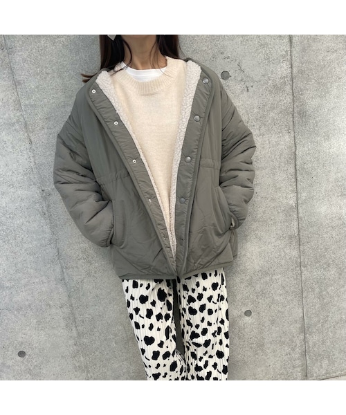 スタイリッシュなキルティング生地、反対面はふんわり柔らかなボア素材でスタイリングに合わせて楽しめる2WAYデザインのデザインアウター。 すっきりとしたノーカラーに、フロントボタンとウエスト部分はドロスト仕様になっており、肩まわりはドロップショルダーでゆったりとしたデザイン。 ヒップがしっかり隠れるやや長めのミドル丈で、スカートにもパンツににも合わせやすく◎ 軽やかな着心地とシルエット、ディティールまでしっかりこだわった今シーズンのおすすめアウターです♪ ※モデル身長:161㎝ ◾️カラー ライトカーキ×ライトベージュ ◾️サイズ M 着丈:70cm 肩幅:56cm 身幅:60.5cm 袖丈:49cm 裾幅:61cm 袖口:12.5cm 裄丈:78cm ※多少の誤差は予めご了承ください。 ◾️素材 【表面】 ポリエステル100% 【裏面】 ポリエステル100% 【中わた】 ポリエステル100%