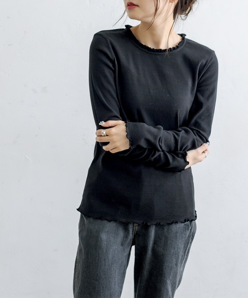 ピュアルセシン 2021 autumn&winter collection【sophisticated retro】◇寒い日は優しい暖かさに包まれたい◇●デザイン毎日着るインナーだからこそ、テンションの上がる1枚を。クルーネックの首元には、ピュアルセシンらしいニットフリルをあしらいました。バックスタイルのボタンも、可愛らしいワンポイントです。袖と裾のメローも重ね着に適しています。着丈、袖丈もしっかりとあるので寒さ対策にも向いています。●カラー展開万能なキナリ、クロの2色です。●素材身頃はコットン100%のカットソー生地。微起毛でふんわりと毛足があり、冬らしい質感です。●スタイリング首開きが大きくて着方に困っているトップスや、キャミワンピ・サロペットのインにもオススメです。デザイン性のあるインナーなので、カーディガンと合わせてメインにも着られます。============================透け感:なし裏地:なし伸縮性:あり光沢感:なし生地の厚さ:普通【スタッフコメント】年齢:30代後半/身長:154cm/普段着用サイズ:Mサイズサイズ感:腰周り以外はほんのりゆとりがあり、薄手な肌着は中に着られます。素材感:とても伸びが良く脱ぎ着も楽です。===============================※撮影場所やお使いのモニター環境により若干お色味が異なる場合がございます。特にロケの撮影では明るく見える傾向にございます。※予約商品はサンプルで撮影をしております。若干の仕様が変更になる場合がございますので予めご了承の上ご注文くださいますようお願いいたします 。