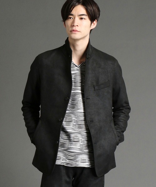 スウェード起毛したカットソーポンチ素材をベースに、ムラプリントを施してレザー調の質感を高めました。ジャージ素材の横張り感とストレッチ性はそのままに、マイクロファイバーを起毛したスウェード調ならではの風合いに同色系のムラプリントを施す事でヌバックレザーの様な質感に近づいています。スタンドイタリアンカラーのカヴァーオールです。特徴的な衿は折り返しても綺麗に収まる縫製と設定にしています。衿まで釦止め出来るので防風性も高く、ストレッチ裏地の総裏仕様なので着心地も抜群です。シェイプを入れた細身のサイズ感で綺麗なシルエットに仕上げています。製品で撥水加工を施して軽い雨や汚れを防ぐ効果をプラスしています。<br>※撥水加工を施していますが防水ではありません。素材の特性上、染み込み難い程度の撥水効果となり、衣料用のデータに基づいた効果で例えますと、水がかかり、手で払ったら細かい滴状の湿潤が残る程度の効果になります。永久ではありませんので洗濯を繰り返すと効果は弱まります。<br>※1564-5110 セットアップで着用出来ます。