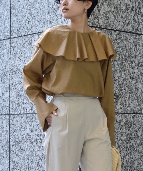 *Detail*襟元のフリルがポイントの着映えブラウス! 前後2way仕様で、前後でフリルのつき方が違い、印象をかえてスタイリングを楽しめる逸品。 程よい甘さとボリューム感で、大人フェミニンな着こなしが叶います。 また袖口の大きめのカフスもポイント◎ *Coordinate* 程よい丈感でIN/OUTどちらでも着て頂けます。 素材もほんのり光沢感があるので、お仕事シーンにもぴったり。 デザイン性が高いアイテムでベーシックなパンツと合わせるだけで、トレンドのスタイリングが完成! オフホワイト モデル:H171 B80 W58 H86 着用サイズ:F キャメル モデル:H171 B80 W58 H86 着用サイズ:F ブラック モデル:H171 B80 W58 H86 着用サイズ:F 洗濯:手洗い可