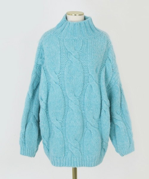 ヒップを十分に覆うくらいの丈感で、安定感があって 前後の長さが少しアンバランスに製作されており 裾を全部外に出して着ても、不自然でないシルエットが演出されます。 厚みのあるニットですが、ドロップされたショルダーラインで 太って見えにくいように作られており、気軽に着用できます。 ハイネックデザインで首を暖かく包み込み 真冬まで十分に活用しやすいです。