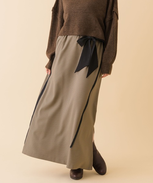 配色のウエストリボンがポイントなチェック柄スカート。秋冬になると必ずトレンド入りするチェック柄ですが、細かい総柄で大人な印象に。サイドのZIPがすっきりとした印象を与えてくれます。スカートをメインに、無地のニットとのコーディネートがおすすめです。