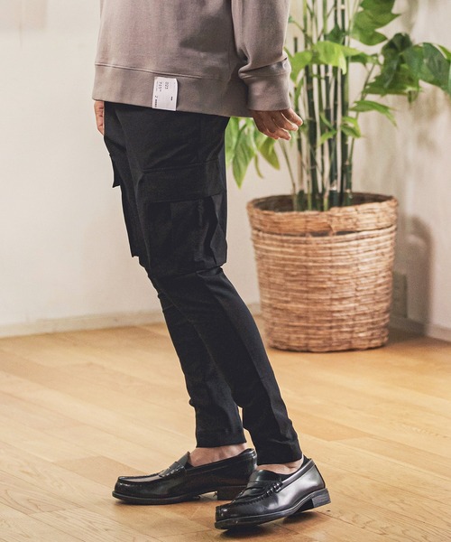 175cm B90-W73-H89 靴26.5cmのモデルがMサイズを着用。ミリタリーの代表的デザインの1つであるカーゴパンツ、ミリタリーテイストの持つメンズアイテムらしい無骨感を残しつつもスキニーテーパードのキレイなシルエットラインを組み合わせ「今」の雰囲気をミックスさせたモダンで都会的な印象のカーゴパンツです。特に膝から裾口にかけてのフィット感あるシルエットがシャープで好印象なスタイングシルエットを演出してくれます。裾口には楕円状にリブを配して着用時のストレス軽減と共に個性あるデザイン性をも兼ね備えています。使用生地のストレッチナイロンはポリウレタン混率が高く伸縮性が非常に高い生地、生地裏(着用時の肌に当たる側)の組織は微パイル状になっており肌触りの良さも兼ね備えています。※着用画像と商品単体画像で色が異なる場合がございます。※商品単体画像を実物により近づけております。