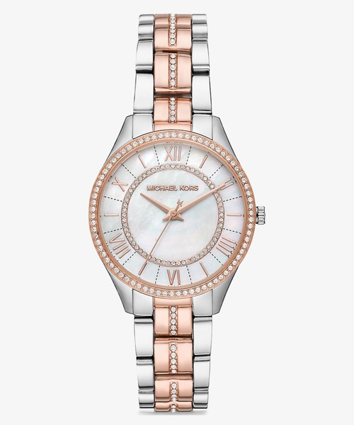 時計塔のようなローマンインデックスとマザーオブパールのダイアルがクラシカルな雰囲気ながら、バランスよく埋め込まれたストーンが華やぎのあるアンティークを思わせるデザインのMINI LAURYN ツートーンウォッチ。デイリーに使いやすいコンビブレスレットの"LAURYN"が毎日の腕元に華やかさを添えてくれます。ケース直径 33mm、厚み 7mmストラップ幅 16mm、ストラップ最長 175mmバックル:三ツ折れ式ムーブメント:クォーツ防水:5 ATM重量:78g〈ご注意〉・商品ご購入時はモニター電池使用のため、お受け取り時に電池が切れている可能性がございます。不良品ではございませんので返品・交換はできかねます。(電池交換は修理対応となります)・修理の際は商品同梱の「保証内容説明書(Warranty information)」と、ZOZOTOWN発行の「納品書」が必要になります。納品書はお買上日を証明する書類となりますので大切に保管して下さい。・製造シーズンにより刻印、ライニングやパーツなどの一部仕様が画像と異なる場合がございます。〈使用方法・商品仕様・修理に関する問い合わせ先〉エフジェイサービスセンター (フォッシル ジャパン)電話 03-4520-2361 (平日11:00 - 13:00 / 15:00 - 17:00)【メンズ商品はメンズショップ(MICHAEL KORS MENS)でご購入いただけます】商品画像の色調・仕様について・お使いのモニターやスマートフォンの機種・設定、お部屋の照明などにより、実際の商品と色調の差が生じる場合がございます。・商品画像はサンプルを撮影しています。実際の商品と、パーツなどの一部仕様に差が生じる場合がございます。・総柄商品について:裁断箇所により、商品一点ごとにパターン(柄)が異なるものがございます。・皮革使用商品について:裁断箇所により、部分的に質感等に若干の差が生じる場合がございます。