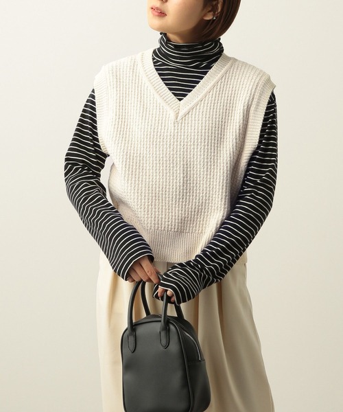 ーーー 【デザイン】 チェック柄見えする編地が可愛いニットベスト。 シンプルコーデのアクセントに取り入れたいアイテムです。 春を先取りできる明るいカラーリングもポイント。 コンパクトだけど、程よいゆるっと感で レイヤードしやすいデザインに仕上げました。 【素材】 肌触りがよく、着心地のよいニット素材。 ーーー 【スタイリング】 ショート丈をいかして、ハイウエストボトムスを合わせた すっきりコーデが◎ インナー次第でカジュアルにもキレイめにも合わせていただけます。 ※屋外の光や照明の当たり具合で、実際の商品と画像の色味に違いが発生する場合がございます。