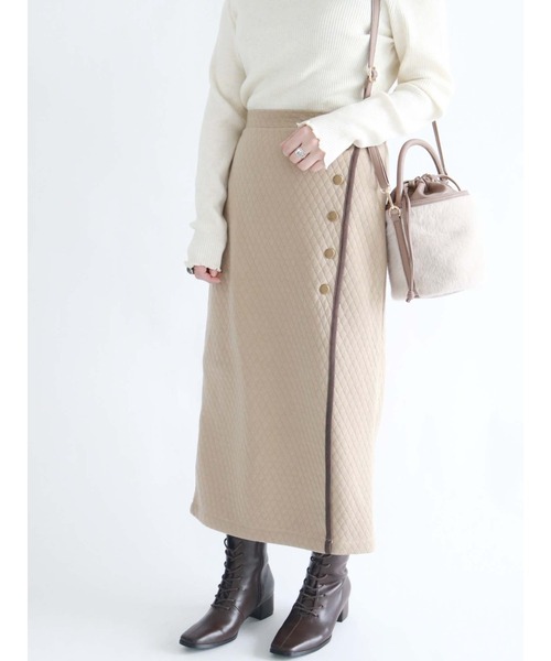 ふっくらと肉厚なキルティング素材がシーズンムードを盛り上げてくれるスカート。サイドの金ボタンと配色パイピングをアクセントに、ラップ風に仕立てたレトロな一枚です。ハイウエストなデザインに、すとんと落ちたストレートラインのミモレ丈で脚長と美脚にも◎。ウエスト後ろはゴム仕様に、伸縮性にすぐれた生地感がストレスフリーな穿き心地を可能にしてくれます。クラシカルなカラー展開にも注目です。