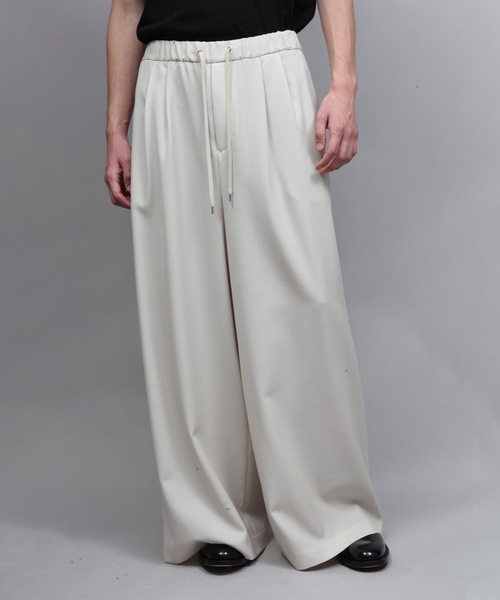 ツータックを深く取ったワイド・パンツです。身幅がとてもワイドでスカートのような感じで、シルエットはそのままストンと落ちていき、立体裁断ならではの大胆なカッティングになっています。分量が多く袴のように太いシルエットです。これ一枚で存在感があります。またウエストはゴムになっており、リラックスして着用していただけます。 素材はハイカウントのシャンブレーで。ウールの温かみとトリアセの軋みがうまく共存したシャリ感のある素材です。 atoの製品にはその商品に携わったパタンナーのネームが付いています。
