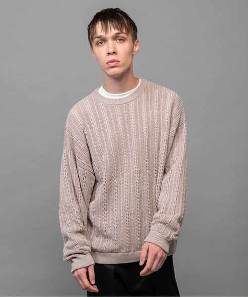 接触冷感と洗濯可能な機能糸を使用したニット。程よい肉感の9ゲージで細かいケーブルと透かし編みをコンビネーションした編み立て。透かし編みにより、インナーとのカラーレイアード感もほんのり出てシンプルに着用するだけでアクセントが生まれる。また、風通しも良いためサマーニットとしても涼しく着用できる。型はリラックスしたサイズ感のクルーネックセーター。素材の表情を生かしてシンプルに仕上げてある。【MR.OLIVE】デザイナー兼ディレクター:長尾亘が2003年よりスタート。アメリカがヨーロッパに強く憧れた1960年代から70年代のカルチャーを基本ルーツとし、ロック・オーセンティック・ドレスという切り口で再構成し、ワードローブとして機能するリアルクロージングを提案。MR.OLIVEのブランド名は男性の総称「ミスター」と女性的な名詞「オリーブ」を組み合わせることで、(相反する要素をミックスする)ことからきている。代官山に構えるコンセプトショップ【WALK IN CLOSET】は実質的な直営店であり、メインでコレクションを取り扱っている。