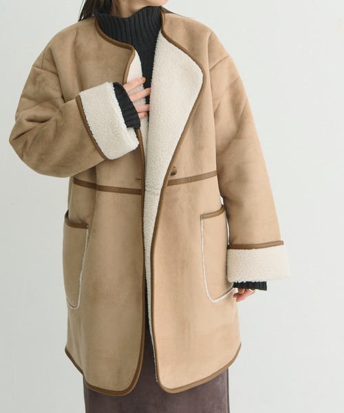 《detail 》 ・さらっと羽織ればスタイリングの主役になる優秀アイテム ・シーズンムード高まるスウェード×ボア ・リラックス感のあるドロップショルダーと程よいゆとり感でこなれた雰囲気 ・ノーカラーなのでタートルネックやハイネックトップスとの相性◎ マフラーやストールなど巻いてももたつかないのも嬉しいポイント ・どんなボトムスとも合わせやすいヒップが隠れるぐらいのちょうどいい丈感 《styling》 すっきりとしたノーカラーデザインなので、トップスは タートルネック・ハイネックと合わせるスタイリングがおすすめ◎ ゆったりしたサイズなので中に厚手のニットも着用可能です。 ヒップが隠れる着丈は細身のパンツはもちろんボリュームのあるワイドパンツと 合わせてもバランス良くスタイリングが決まります。 《fabric》 スウェード部分は滑らか、ボア部分はほわほわな肌触り ・透け感:無し ・裏地:無し ・伸縮性:無し ・生地の厚さ:普通 【商品のお気に入り登録】 完売カラーの再入荷通知やラスト1点の通知 プライスダウンの通知も受け取ることができます。 ぜひご登録ください◎ 【ブランドのお気に入り登録】 新商品や再入荷など、 ブランドの情報をいち早くお知らせします! ぜひご登録ください◎
