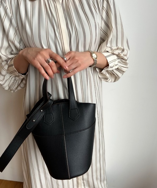 シボ感のある高見えフェイクレザー素材のバケット型バッグ。内側のボタンの留め位置を変えると、異なる表情を楽しめる2wayデザイン。フロントの切り替えはポケットになっており、ちょっとした小物も入れられるのがうれしい。マチがあるので収納力も◎長財布も入るサイズ感です。綺麗なデザインなので、オフィスやセレモニーシーン(卒入園式、卒入学式)にも人気の鞄です。・取り外せるショルダーストラップ付き・ポケット…外2、内1