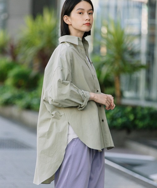 □2022 SPRING & SUMMER COLLECTION□◆ さらっとした肌ざわりのコットン素材を使用したシンプルながらも計算された女性らしいシルエットがポイントのシャツアウター◆<MATERIAL>近江晒加工を施した綿/100の40/-ダンプです。近江晒加工は生機をゆっくりもみほぐすことで、膨らみやナチュラルなシボ形状を与え特殊加工により、その表情を保持しています。製品洗いはかかっていませんが、洗いざらしのドライなタッチと膨らみ感を表現できます。しっかり目が詰まっていてシャツでも羽織物としても使える肉感です。<DESIGN>ライトアウター用途としても使える着回力のあるシンプルシャツです。ドロップショルダーでゆったりとしたサイジング、着丈に前後差をつけてフロント側はオーソドックスな着丈、バックはヒップがすっぽり隠れる丈にしています。脇接ぎを少しフロント側にし、前後のバランスをフロントがややコンパクトに見えるように拘って作っています。かま底がかなり低く、アームホール側が極端に太い袖にしてシンプルなシャツのデザインにシルエットでアクセントをつけています。バックやサイドのスタイルが特徴的で膨らみのある女性らしいシルエットになっています。<COLOR>■ホワイト:エッグシェルっぽいニュアンスのあるホワイト。洗いざらしのカジュアルな雰囲気ですが高級感があります。■ダークブラウン:浅めの発色で重くないダークブラウン。濃色の中では新鮮味の強いカラーです。■ライトグリーン:落ち着いたペールトーンのグリーンで、びっくりするくらい何色とも組み合わせできるカラーです。*光のあたり具合いやパソコンなどのモニター環境によって実際の色味と異なって見える場合がございます。予めご了承ください。*お取扱いについては、商品についております品質表示、アテンションタグにてご確認ください。洗濯:洗濯機洗い可.............................≪INFORMATION ≫............................▼商品のお気に入り登録▼『♡』マークを押してお気に入り登録して頂いた商品は、セール開催の通知やクーポン発行などのキャンペーンなど、お得な情報をいち早く受けとる事が出来ますので、ぜひご登録ください。