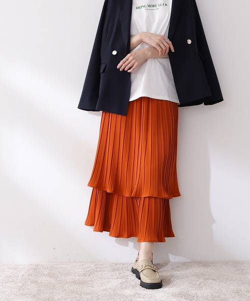 ストンと落ち感のある素材で仕立てたプリーツスカート。細かいプリーツ加工に低い位置で切り替えを入れたティアードデザインがポイント。広がりを抑えたシルエットながら、歩くと揺れるヘムラインが足元を軽快に見せてくれます。シンプルなゆるニットやカジュアルなスウェットトップスとの着こなしも楽しめます。