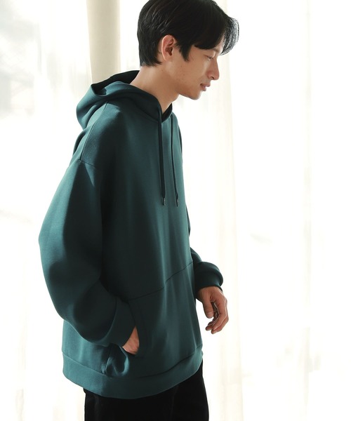 大人気のダンボール素材を使用したフーディー。 シンプルながらも、スポーティな雰囲気もある、洗練されたデザインです。 ゆったりとしたシルエットの中に、切り替えラインをプラスし、メリハリのある1枚です。 【素材】 これまでのダンボール素材のつなぎ糸で使用していた、モノフィラメント糸を使用しないことで、弾力を軽減しやわらかさと軽さがアップ。 チクチク感もなく、軽い着心地が魅力です。 【スタイリング】 テーパードシルエットのスリムパンツと合わせると、好バランスに。
