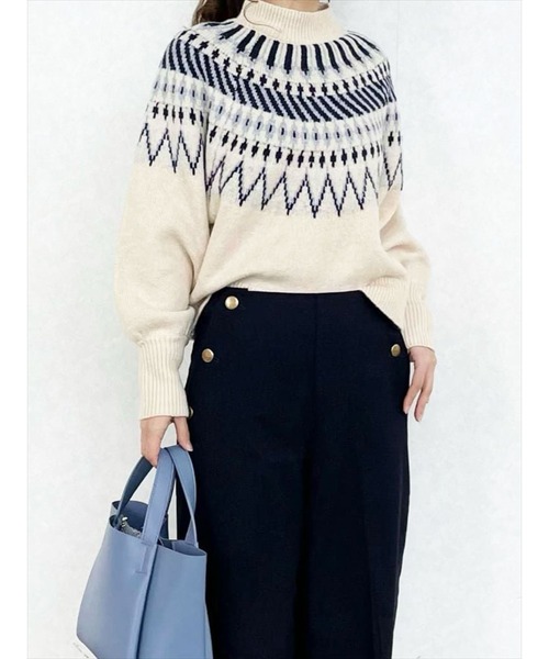シーズンムードも高まる求心柄がアクセントになったニット。ほっこりとしたあたたかみのあるデザインで、コーディネートのポイント使いにもぴったり。ショート丈でウエスト位置も高く見せ、脚長効果も期待できます。洗濯機洗いが可能なのでご家庭でケアしやすいのも魅力。デイリーユースにも重宝しそうなアイテムです。