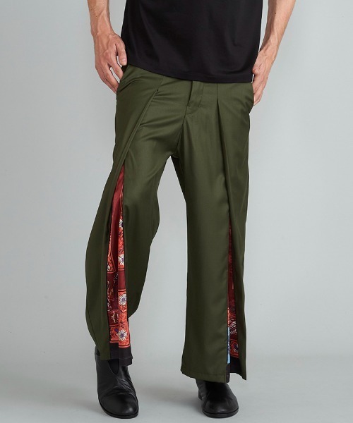 2022 SS COLLECTON VOL.1450006-810Cと同じ素材でデザインされたバギーシルエットのトラウザーズ。フロントには深めに取ったタックの内側にファスナーを付けており開く事でスカーフ生地が広がる斬新な発想の切替を施している。タックによる生地のゆとりと柔らかいスカーフ生地が合わさりさりげないドレーピングが表現されている。バックウエストには平ゴムを内蔵しサイズの幅に広く対応できるになっている。春夏シーズンだからこそ使える生地の組み合わせにより個性溢れる一本が完成した。トレンド性のあるニュートラルカラーのベージュ、カーキに始まりトレンドに左右されないベーシックカラーのネイビー、ブラックとカラーバリエーションも豊富に備えている。