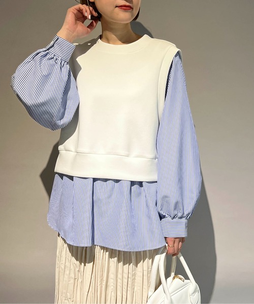 コーデの主役にピッタリなプルオーバー。 身頃部分は伸縮性のある段ボールニット生地を使用し、 袖や裾には布帛のストライプ生地をドッキング。 伸縮性のある生地と程よくゆとりのあるサイズ感で 動きやすくストレスなく着用できる一枚です。 ボリューミーなバルーンスリーブで可愛らしさもあり、 カジュアルからキレイめまで大人スタイルに活躍するアイテムです。 ※ライトグレーは身頃もライトグレーです。 model:H164 着用サイズ:M ※撮影場所や明るさにより 実際の商品と色味が若干異なる場合がございます。 ☆商品のお気に入り♡登録を押せば ”再入荷通知”や”残りわずか通知” 値下げのお知らせが届きます! お気に入りのブランド登録していただければ新商品入荷のお知らせも届きますので 是非登録してみて下さい。