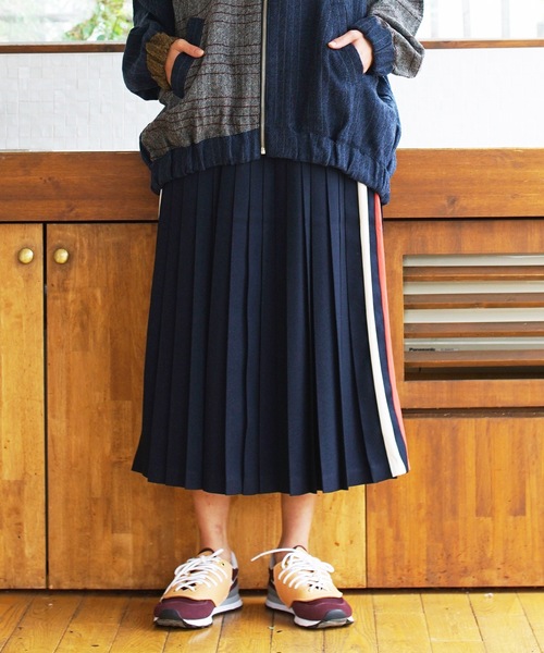 STOF、bedsidedramaをはじめとし、特別なアイテムが揃う “SAMVA” ここでしか買えない限定アイテムを発売いたします。 ウールライクな見た目でありながら、洗濯も簡単で毛玉もできにくい機能素材「LANATEC」を使用した配色プリーツスカート。 サイドには2色のラインでアクセントカラーを配置しました。 程よく厚みもあり、シワになりにくくプリーツもしっかり維持されます。ウエストはゴム仕様。左右にポケット付きです。 ウエストはゴム仕様でストレスなく着用できるアイテムです。