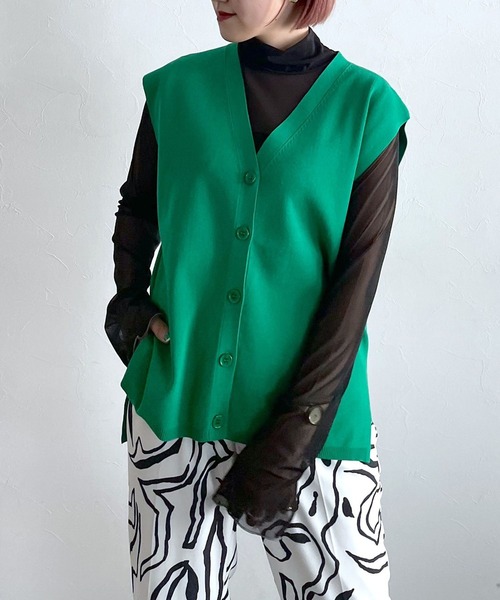 カーディガンのようなデザインが特徴のニットベスト程よい厚みとさらっとした表面感の素材で、スタイリング次第でキレイめにもカジュアルにも。寒い時期には長袖アイテムと重ね着し、暖かい時期にはそのままノースリトップスのような雰囲気でも着ていただけます。厚すぎず薄すぎずな素材感で、シーズンを選ばず着ていただけるアイテムです。〈注意事項〉・サンプルにて撮影をしておりますので、実際の商品とは仕様や加工・サイズ等が若干異なる場合がございます。・モニター・環境等により実際の商品と色味が多少異なって表示される場合がございます。予めご了承をお願いいたします。・撮影環境により、光の当たり具合で色味が違って見える場合があります。あらかじめご了承下さい。▼気になるアイテムは《お気に入り登録》がおすすめです!完売カラーの再入荷情報、セール情報、ラスト1点の通知を受け取ることができます!▼《ブランドのお気に入り登録》で新商品や再入荷などのお得な情報をいち早くお知らせします