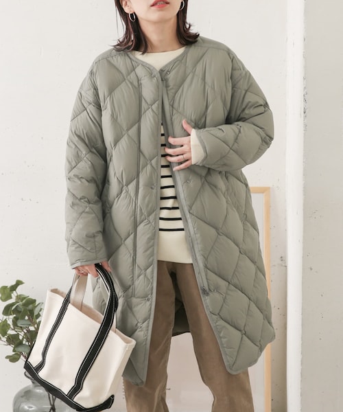 ライトな着心地とダウン混の暖かさを兼ね備えたキルティングコートは、シンプルなデザインにこだわった大人のカジュアルスタイルにマッチするアイテム。ドロップショルダーながらも着膨れしないスッキリとしたシルエットや、ヒップラインまですっぽり包み込むロング丈が女性らしい抜け感を演出。クルーネックのノーカラーデザインはタートルやフードアイテムにもレイヤードしやすく、マフラーなどの小物使いでコーディネートの幅を楽しめるアウターになっています。※商品の特性上、縫い目部分からダウンやフェザー、中綿などの詰め物が出ることがありますので、ご注意ください。※保管は、高音多湿を避け、風通しの良い冷暗所にしてください。※その他お取り扱いに関しましては、商品に付属のアテンションタグをご覧ください。総重量 : 約380g-----------------------------《スタッフ着用コメント》[スタッフE]年齢 : 20代後半, 身長 : 155cm, 体型 : 普通 普段の着用サイズ : S,M 【着用カラー/サイズ】NAVY/one【サイズ感】 身長155cmで膝ちょうどの丈でした。薄手のトップスと合わせましたがアーム部分にまだ余裕がありニットもスムーズに入れていただけそうです。【素材感, 着心地】 着ていることを感じないほど軽く、着用後じわじわとすぐに暖かさを感じました。シワになりにくいところもオススメポイントです◎車移動が多く重厚感のあるコートはいらないといった方にもぜひ一度手に取っていただきたいです!-----------------------------※商品画像は、光の当たり具合やパソコンなどの閲覧環境により、実際の色味と異なって見える場合がございます。予めご了承ください。※商品の色味の目安は、商品単体の画像をご参照ください。透け感:なし伸縮性:なし裏地:あり光沢:ありポケット:あり