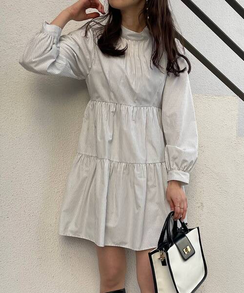 スタンドネックが上品な印象を与え甘めになりすぎず、きっちり感とかわいさを兼ね備えたワンピース☆ ボリューム感がありゆったりと着れるので、気になるヒップや腰回りをカバーしてくれる嬉しいアイテムです◎ 涼しげなストライプ柄とさらっとした生地感が着心地よく、さわやかな大人の印象に♪
