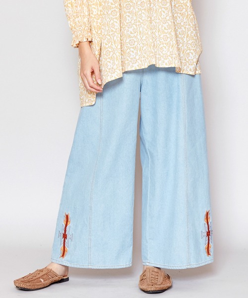 贅沢な刺繍が心を魅了する。カジュアルシーンにぴったりなワイドシルエットで、普段のコーディネートに取り入れやすいデニムパンツ。 ステッチの色が配色になっているのもポイント。 軽い穿き心地のデニム生地で、シーズンを問わず着回し力抜群!あなたらしく自由に纏おう。 ※こちらの商品は1点1点職人による手作りとなります。その為、形や色合い・模様など若干異なる場合がございます。あらかじめご了承ください。 ※屋外での撮影画像は、光の当たり具合で色味・カラーが違って見える場合がございます。商品のカラーは、スタジオ撮影の画像をご参照ください。 Amina Collection Co.,LTD.