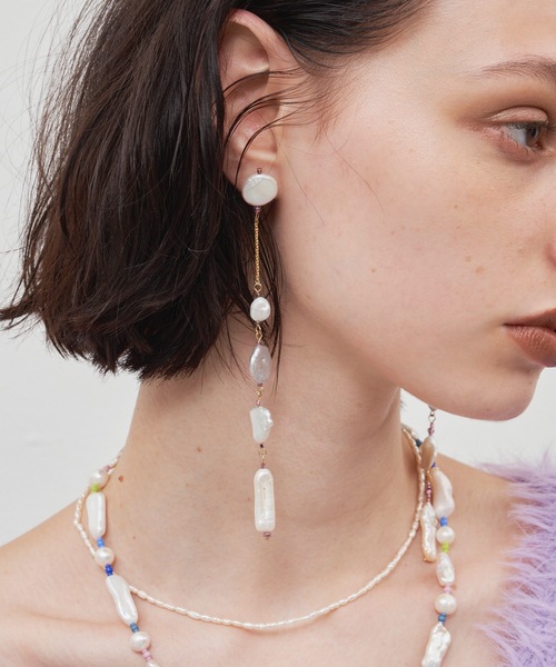 ▽デザインポイント コイン型など様々な形のした淡水パールをMixに連ねたピアス。 左右対称に合わせることに拘り、ゴールドチェーン、ビーズとベースとなるチェーンに変化をつけたデザインです。 淡水パールとは他種のパールと比べて形や大きさも幅広く、ファッションシーンにおすすめなパールです。 汗や水にも強く、耐久性に優れており長く着用していただけます。 ※淡水パールは天然の素材を使用している為自然なキズやへこみ、くぼみが生じております。 不良ではございませんのでご了承下さい。 サイズ補足 ビーズ(右):13cm チェーン(左):12cm ▼商品のお気に入り登録 値下げ・再入荷・在庫1点などの通知を受け取ることができます。 お気に入り登録された方だけの特別なセール通知が来ることも...! ▼ブランドのお気に入り登録 新商品や再入荷など、ブランドのお得な情報がいち早く届きます。