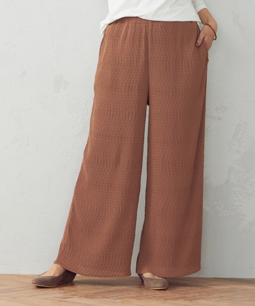 《素材》 薄手のジョーゼットに、 楊柳風のナチュラルなワッシャーで柄を表現した素材です。 サラッとした肌ざわりと、なめらかな落ち感が特徴です。 《デザイン》 楊柳風の柄が特徴の、イージーワイドパンツです。 ワイドシルエットですが、 落ち感のある素材なので、広がりすぎずスッキリとした印象。 ワッシャーがストレッチのような伸縮となり、 更にウエスト一周ゴム仕様で、ストレスのない履き心地。 きれいめな印象と、着心地の良さを兼ね備えたアイテムです。 ※画像の商品はサンプルとなりますので実際の商品と仕様、加工、サイズが若干異なる場合がございます。 ※こちらの商品はFIVE FOXes独自の採寸方法となっています。 本サイトのサイズガイドと採寸方法が異なる場合がありますのでご了承ください。