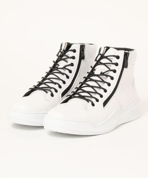 厚底のブーツライクなスニーカーソールを採用した、ハイカットブーツスニーカーを展開。柔らかく高級感ある合皮スムースを採用。ファスナーをW付けする事でスポーツモードなデザインに落とし込んでます。脱ぎ履きのし易さもポイントです。カップインソールを採用することで履き心地も良くしました。