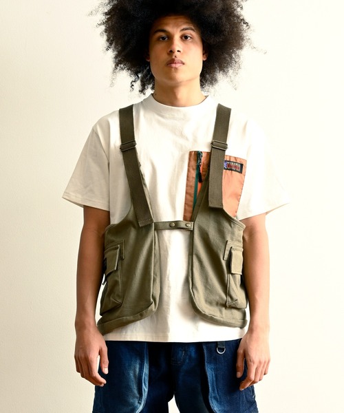 キャンバス生地とデニム生地を採用したストレージベストです。 大容量のポケットがサイドに付いたデザインで、取り外すとショルダーバッグになります。まさに着る BAG のデザインとなっています。【WILDERNESS EXPERIENCE | ウィルダネス エクスペリエンス 】「着るバッグ・履くリュック」キャンプ、フェス、アウトドアなど外遊びに軽装で行けて、楽しめるウェアをテーマに「Useful play」(あると便利)なディテールを施したデザイン。WILDERNESS EXPERIENCEのメインアイテムである「ザック」からインスパイアされたラインナップです。