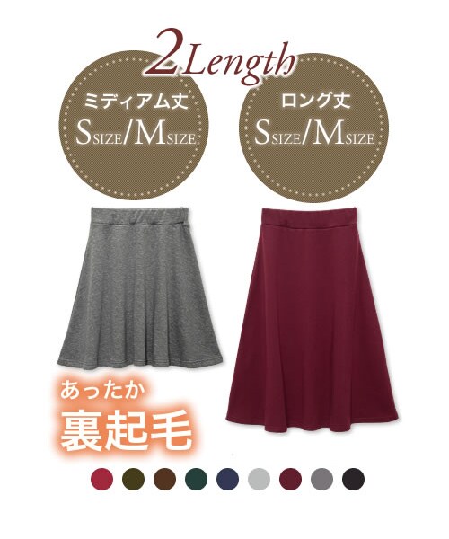 商品説明ふわふわの裏起毛で寒い日もあったか♪寒くなるこれからの季節に大活躍の裏起毛スカートです。ウラがふわふわの起毛なので、あたたかさ間違いなし!しっかり肉厚なのに着膨れしにくく美しいシルエットをキープ。てろんとした高級感あるシルエットに。 しかもお家でしっかり洗えるので汚れても平気!冬のお出かけにぴったりです。好みやシーンに合わせて選べる2丈も魅力。テッパン人気!コンパクトなひざ上のミディアム丈と、今年流行のミモレのロング丈の2丈から選べます。しっかりあたたかくてこの価格だから絶対オススメ!