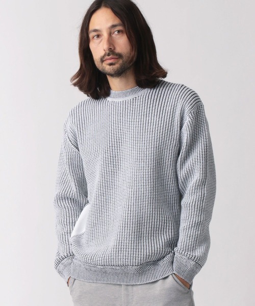 綿とポリエステル糸を使用しミドルゲージで編んだ配色ニットを展開。ポリエステル糸を使用している為、軽く、柔らかい肌触りが着心地を良くし、脇の配色切替と編地のボリューム感に変化を付けることでインパクトのある見え方にしています。クルーネックデザインでトレーナーライクな仕上がり。サラッとした肌触りでチクチク感もなく、キックバックの効いた質感が快適な着心地です。
