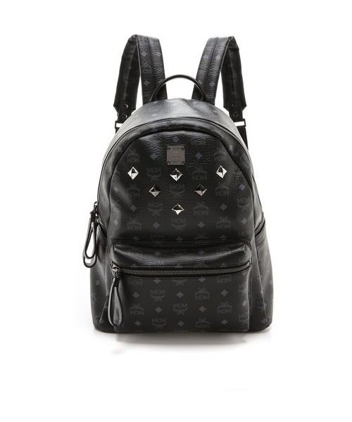 Coated canvas constructs a monogrammed MCM backpack, and mixed-metal studs detail the exterior. A zip pocket flanks the front, and the sides are outfitted with slim patch pockets. Adjustable, padded shoulder straps and locker loop. The 2-way zip top opens to a logo-lined interior with a tablet slot, 1 zip compartment, and 2 small pockets. Dust bag included. Weight: 74oz / 2.1kg. Imported, Korea. MEASUREMENTS Height: 16in / 40.5cm Length: 14in / 35.5cm Depth: 11in / 28cm