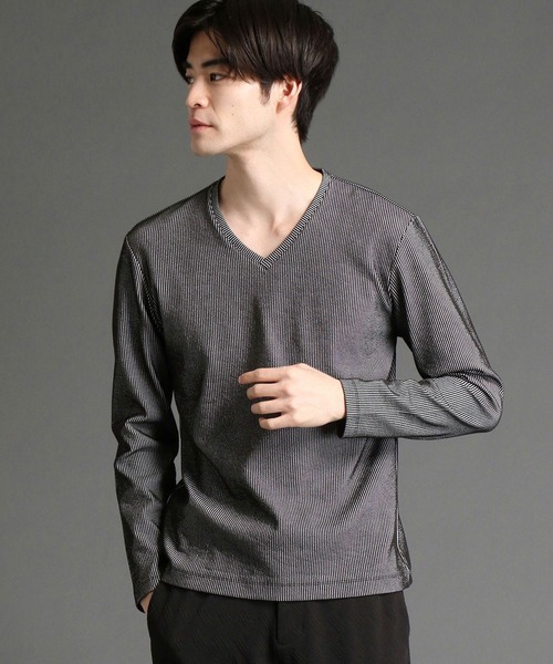 布帛の様なシアサッカーをハイゲージニットで表現したVネックカットソー。凹凸のある編地により清涼感があり。ドライタッチな肌離れの良さでストレスフリーな着心地です主張し過ぎないサッカー効果、軽くてハリコシがある風合いはインナーアイテムに最適。シルケット加工により上品な光沢と張り感を持たせ高級感を演出。ハイダブラックらしい大人受けするカットソーとなっています。