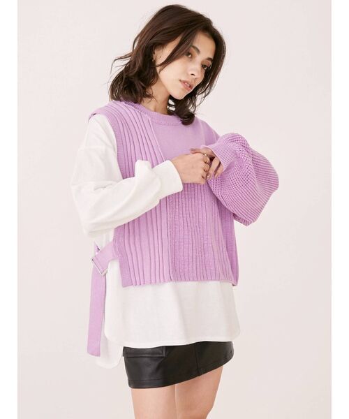 アシンメトリーなニットベストとロンTEEをドッキングしたデザインのニットトップスです。ゆるっとしたシルエットで小柄な方はチュニックっぽく着用することも可能。