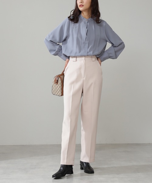 ベーシックデザインが万能なカラーストレートパンツ。明るいカラーがアクセントとなり、ONにもOFFスタイルにもフェミニンな雰囲気をプラス。センタープレスが施されているので、ストレートラインを上品に演出します。ウエストの後ろはゴム仕様なので、トップスを前だけインしても腰まわりがすっきり決まるので穿き心地の良い仕上がりです。足元はローファー、パンプス、サンダルまでコーディネートに合わせて着用しやすくなっています。