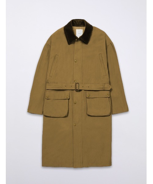 コーデュラのコットンナイロン混紡糸で丈夫に織られたバックサテン生地裏地:中肉のチェック柄ウール生地両サイド:ドットボタンで開閉可能なスリットポケット:マチあり サイドにもポケット口あり