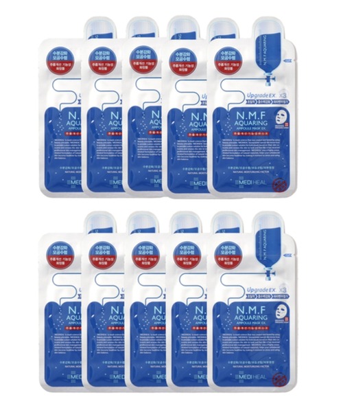 お得な10枚セット登場! 【MEDIHEAL N.M.F AQUARING AMPOULE MASK EX /メディヒールN.M.F アクアリング アンプルマスクEX】 メディヒールのマスクの中でも特に人気のあるアクアリングアンプルマスク。 <保湿力UP、毛穴ケア、ハリ感UP> 保湿、美肌、ツヤ、ハリ 自然由来の保湿因子(N.M.F)と保湿効果力の高いヒアルロン酸Na、ハマメリス水が 潤いのあるしっとりとした肌を保ちます。 さらに植物性成分であるアラントイン、トレハロースが肌を引き締め、ハリのある肌へ導きます。 (成分) 水、グリセレス-26、PEG/PPG-17/6コポリマー、グリセリン、ヒアルロン酸Na、1,2-ヘキサンジオール、ヒドロキシエチルウレア、センチフォリアバラ花水、エブリコエキス、ハマメリス水、アーモンドエキス、グルタミン、グルタミン酸、アルギニン、アラニン、フェニルアラニン、プロリン、スベリヒユエキス、加水分解コラーゲン、アロエベラ液汁、β-グルカン、キサンタンガム、BG、ボスウェリアセラタ樹脂エキス、セイヨウシロヤナギ樹皮エキス、パンテノール、トレハロース、ベタイン、カルボマー、アラントイン、ポリソルベート80、EDTA-2Na、酢酸トコフェロール、香料、ポリグルタミン酸 (使い方) 1.洗顔後、化粧水で肌のキメを整えてから、マスクシートを取り出し、顔の形に合わせて密着させます。 2.約10~20分程度、ゆっくりとくつろいだ後、マスクシートを取り外します。 3.残ったエッセンスを軽く叩くように馴染ませます。 (使用上の注意) ■お肌に異常が生じていないかよく注意してご使用してください。化粧品がお肌に合わないとき即ち次のような場合には、使用を中止してください。そのまま使用を続けますと、症状を悪化させることがありますので、皮膚科専門医等にご相談されることをおすすめします。また、傷やはれもの、しつしん等の異常がある部位には、ご使用にならないでください。 (1)使用中、赤味、はれ、かゆみ、刺激、色抜け(白斑等)や黒ずみ等の異常があらわれた場合 (2)使用したお肌に、直射日光があたって上記のような異常があらわれた場合 ■目に入らないようご注意ください。目に入った場合は、こすらずにすぐに洗い流してください。その後、目に異物感など異常が残る場合は、眼科専門医へご相談されることをおすすめします。 ■極端に高温又は低温の場所、直射日光のあたる場所には保管しないでください。 ■開封後はなるべくお早めにご使用ください。 ■乳児、子供の手の届かない所に保管してください。 ※商品タグに記載されている商品名がWEBでの表記名と異なる場合があります。 ※実際の商品と仕様、加工、サイズが若干異なる場合がございます。 ※照明の関係により、実際よりもやや明るく見える場合がございます。またパソコンなどの環境により、若干製品と画像のカラーが異なる場合もございます。予めご了承くださいませ。 【お気に入り登録】してお得な情報をCHECK!! ・「商品のお気に入り登録」で再入荷通知や、ラストの通知、セール通知も受け取ることができます。 ・「ブランドのお気に入り登録」で新商品や再入荷など、お得な情報を受け取ることができます。 __________________________________________________________
