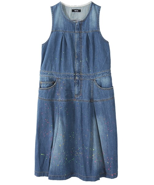 中肉のノースリーブワンピース。ゆったりとしたシルエットにカラフルな絵の具のペイントがポイント。胸元からウエスト部分までジッパーをほどこしています。この製品は独特な風合いを出すため、製品加工を行っております。1点ごとにサイズや風合い等、特徴が異なりますのでご了承ください。Torso:H163.5 B80 W58.5 H86 着用サイズ:02サイズ