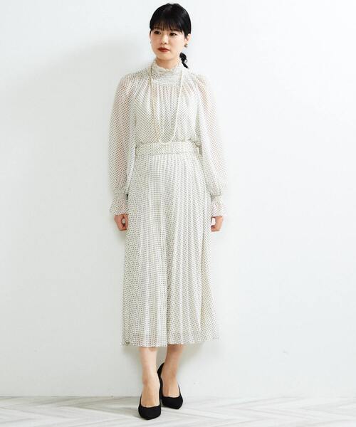 オリジナルのピンドットで、上品な柄に合わせたクラシカルなタイプのブラウスです。 より、きちんと感がありアウターの邪魔をしないのに、1枚で着ても地味にならない、衿ぐりのシャーリングがアクセントになっています 。シンプルな形なので、袖口のシャーリング先に優しくフリル部分を作り、女性らしさを取り入れています。